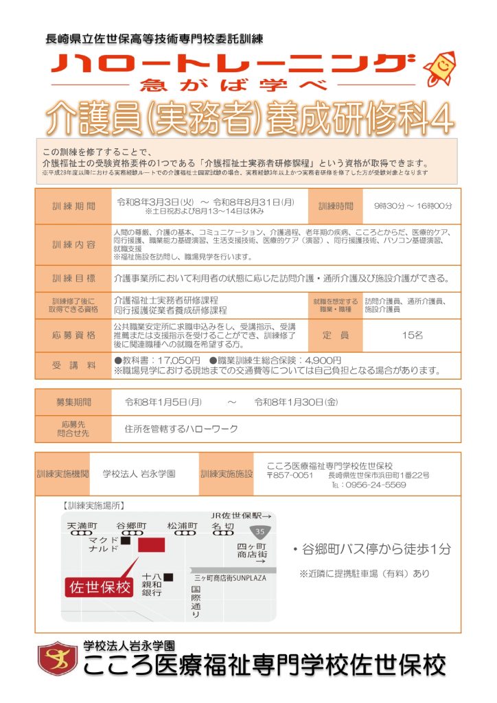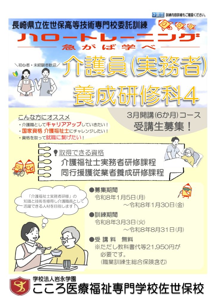 ハロートレーニング 介護員(実務者)養成研修科 受講生募集のお知らせ