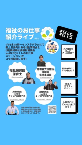 【実施報告】~福祉の仕事紹介~(福)清和会×(福)長崎県社協 welなが(ふくしのお仕事ステーション) インスタグラム コラボライブ配信 1月 26, 20261月 26, 2026イベント情報・情報発信 ↓画像を押すとライブ映像が見れます 令和8年1月21日(水)18:00~ ライブ配信します!出演者:(福)清和会福見保育園 保育士障害者支援施設清和園 生活支援員 (福)長崎県社会福祉協議会 welなが(ふくしのお仕事ステーション)キャリア支援専門員 開催までインスタグラム アカウントをフォローしてお待ちください