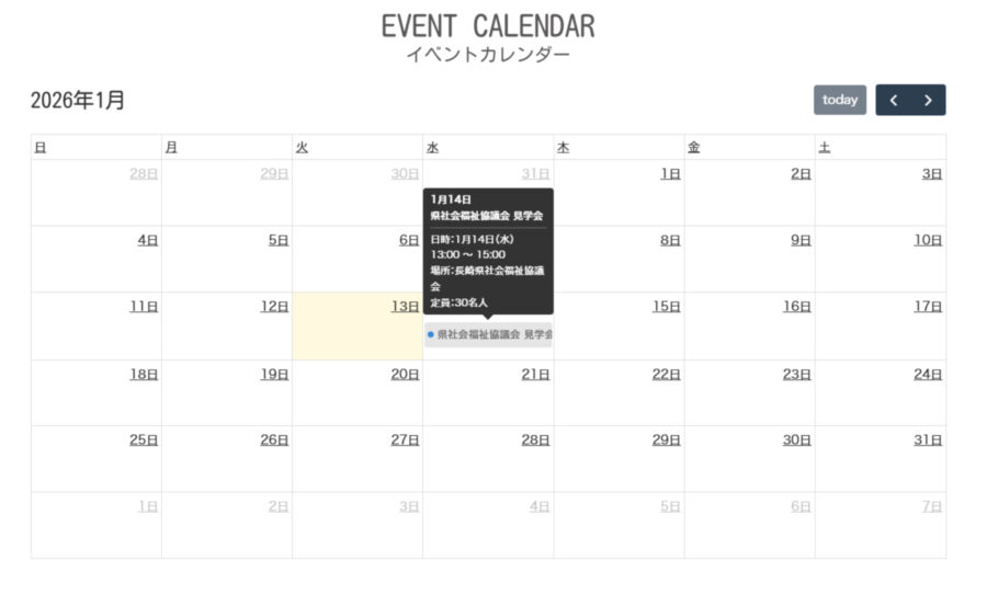 見学会や就職フェアなどの開催情報を一覧で確認できるカレンダーを設置。法人更新ページで登録したイベントは自動反映されるため、掲載の手間が減るうえ、求職者が迷わず情報へアクセスできるようになります。