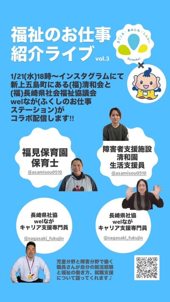 【実施報告】~福祉の仕事紹介~(福)清和会 × (福)長崎県社協 welなが(ふくしのお仕事ステーション) インスタグラム コラボライブ配信